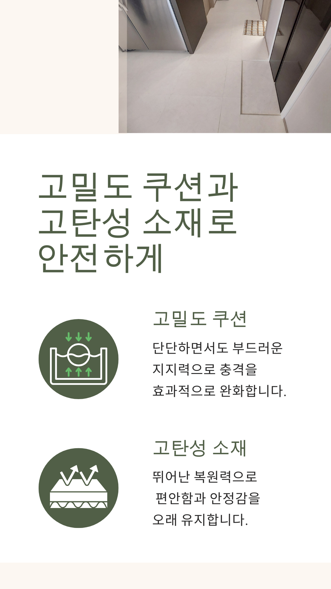 층간소음을 효과적으로 줄이고, 충격 완화 성능을 강화했습니다.
